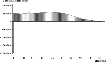 Először is látható, hogy a görbe hatalmas zuhanással kezdődik. Az egységes évfolyamnak tekintett jövő nemzedék egy főre jutó számlája 4 760 000 forint (további részleteket a Függelék F1. táblázatában tüntettük fel), az éppen a kezdő évben születetteké (a nullaéveseké) viszont kevesebb mint 285 000 forint. Ez az eltérés adja a korosztályi elszámolás legfontosabb mutatóját. Ha a rendszerben meglévő hiányokat teljes egészében a mostantól megszületőkre terheljük, 4 475 000 forinttal nagyobb életpálya-befizetésekkel kell számolniuk, mint azoknak, akik már benne vannak a rendszerben, és még az egész életpálya előttük van. Ez az érték rendkívül súlyos belső feszültségre utal, több mint havi 5300 forint pluszköltséget jelent, 2000-es jelenértéken, 70 éves élettartammal számolva.