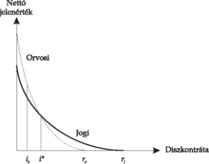 A nettó jelenérték és a megtérülési ráták alapján hozott döntések ellentmondásba kerülhetnek egymással. Nézzünk erre egy példát! Tegyük föl, hogy egymást kizáró két beruházási lehetőségről kell döntenünk – például vagy az orvosi, vagy a jogi egyetemen kívánjuk folytatni tanulmányainkat. A kétféle emberi tőke nettó jelenértékét különböző diszkontráták mellett a 2. 4. ábrán ábrázoltuk.